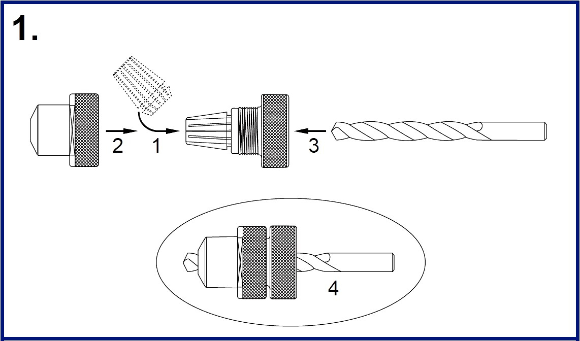 Follow up the Steps 1, 2, 3, 4 for set up the drill to the collet holder. ( with out tighing) ***as shown on diagram #1