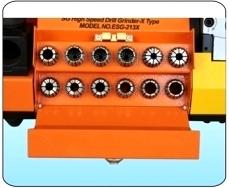 Insert the collet holder with drill to the secondary clearance angle grinding port and push to the grinding wheel slowly to grind the secondary clearance angle of drill until the grinding. Take out the collet holder with drill and change to the other side (turn 180 degree) to grind again in same way as above mentioned.***as shown on diagram #6