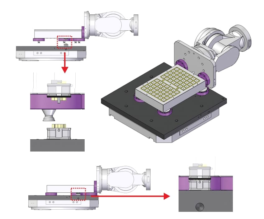 零點定位系統的核心理念在於建立一個固定且高度精準的基準點,使治具、模具或工件在每次安裝時都能快速回到相同的位置。透過高精度定位銷與鎖緊機構的設計,零點定位系統能夠實現微米等級的重複定位精度。當加工治具或模具在不同機台之間轉移,或是在同一機台上進行更換時,只需將其放置於零點基準位置並完成鎖固,即可立即開始加工,而不需要再次進行繁瑣的對刀與校正作業。這種高度標準化的定位方式,大幅減少了機台停機時間,使設備的有效運轉率顯著提升。